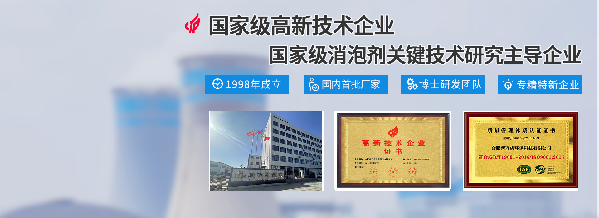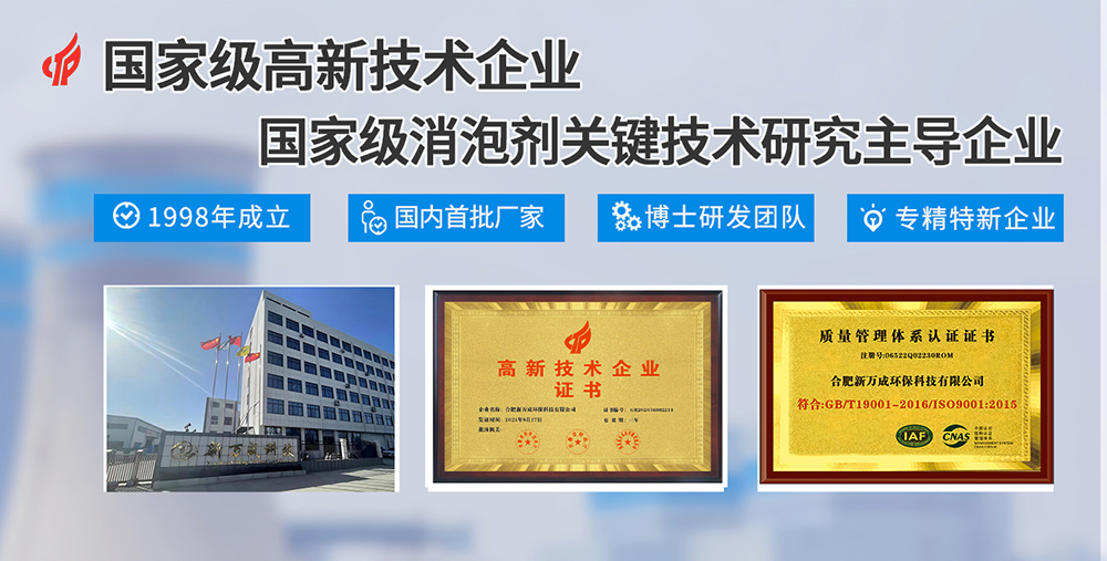 合肥新万成环保科技有限公司是一家集消泡剂的生产、研发、销售于一体的行业内国家级高新技术企业,专业销售消泡剂等化学助剂,主营业务包括:化工助剂、国际贸易、电子商务、建材涂料等;同时,公司采用国际化的现代管理模式,已取得了ISO9001质量管理体系、ISO18000职业健康安全管理体系认证及重合同守信用单位认证等诸多殊荣。 自公司成立至今,经过20年稳健的发展,已成长为国内化工助剂行业屈指可数的一家集研发、生产、销售、售后于一体的企业。较强的自主研发能力和技术创新能力,使得我们的业务遍布全国,生产的产品畅销海内外,经营的业绩稳定增长。